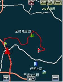 第四步:系統(tǒng)自動(dòng)將此桿塔位置的預(yù)設(shè)軌跡路徑載入到電子地圖中,同時(shí)標(biāo)注出此時(shí)用戶的當(dāng)前位置,用戶參照自己的當(dāng)前位置和電子地圖中的軌跡路線前進(jìn)至桿塔位置。電子地圖中可以放大縮小比例尺,以可以更加清晰準(zhǔn)確的指引行進(jìn)。